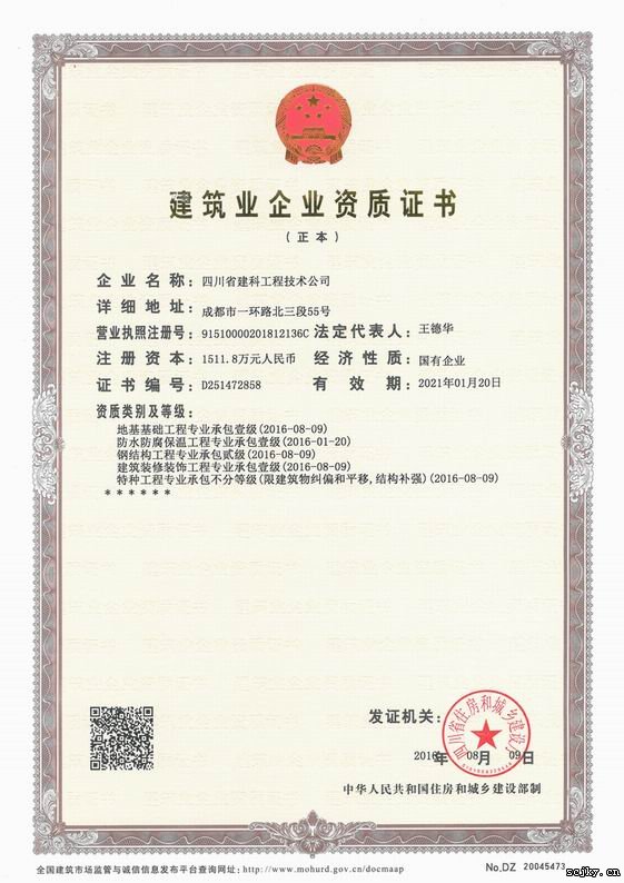 為了搭建更具競爭力的資質(zhì)平臺(tái),四川省建科工程技術(shù)公司經(jīng)過多年不懈努力,終于于2016年8月9日取得地基基礎(chǔ)工程專業(yè)承包壹級、防水防腐保溫工程專業(yè)承包壹級、建筑裝修裝飾工程專業(yè)承包壹級、特種工程專業(yè)承包不分等級(限建筑物糾偏和平移,結(jié)構(gòu)補(bǔ)強(qiáng))、鋼結(jié)構(gòu)工程專業(yè)承包貳級等五項(xiàng)專業(yè)承包資質(zhì)。這次公司資質(zhì)升級成功使公司資質(zhì)平臺(tái)又上了一個(gè)新的臺(tái)階。公司現(xiàn)有資質(zhì)可承擔(dān)工程范圍如下: